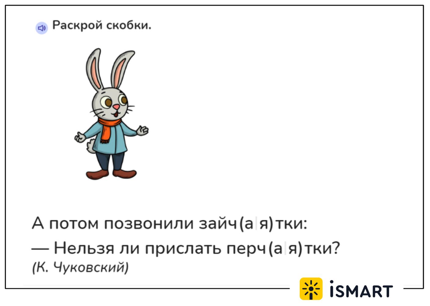 А ещё закрепить свои знания, довести их до автоматизма можно, занимаясь на образовательной платформе iSmart. С ней изучение русского языка станет интересной, увлекательной игрой, облегчит прохождение школьной программы и поможет в обучении. Онлайн-платформа iSmart содержит 300 000 заданий на отработку 12 000 навыков, в среднем на изучение одной темы предлагается 56 ярких, красочных, увлекательных и неповторяющихся интерактивных заданий.
